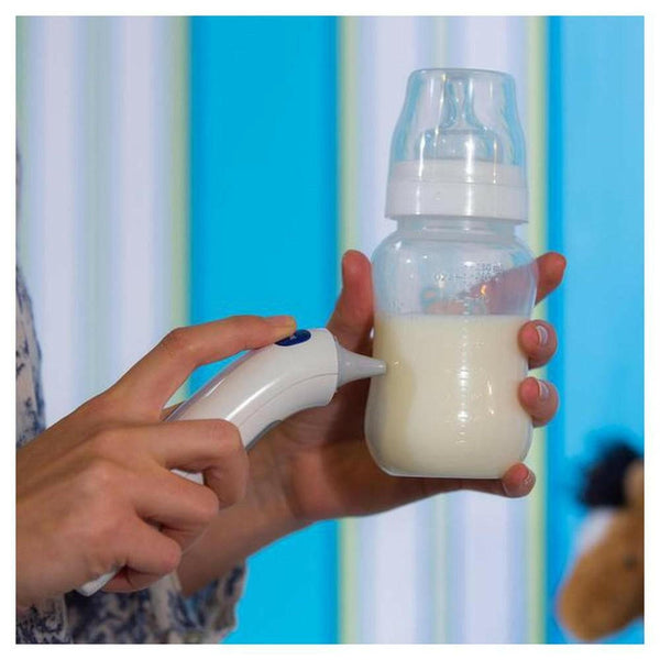 Met deze thermometer kun je ook de temperatuur meten van de omgeving of van voorwerpen, zoals een babyfles met voeding. Dat werkt zo: