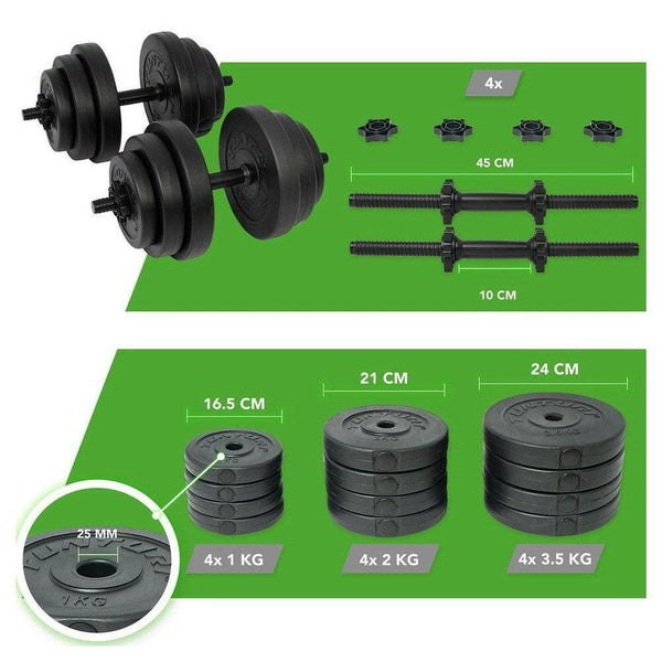 2 dumbbellstangen van elk 1 kg, 4 schroefsluiters en 12 halterschijven (4 x 1 kg, 4 x 2 kg en 4 x 3,5 kg)