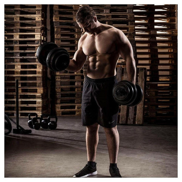 Je kan kiezen uit een dumbbell set met een totaalgewicht van 15 kg of 28 kg: