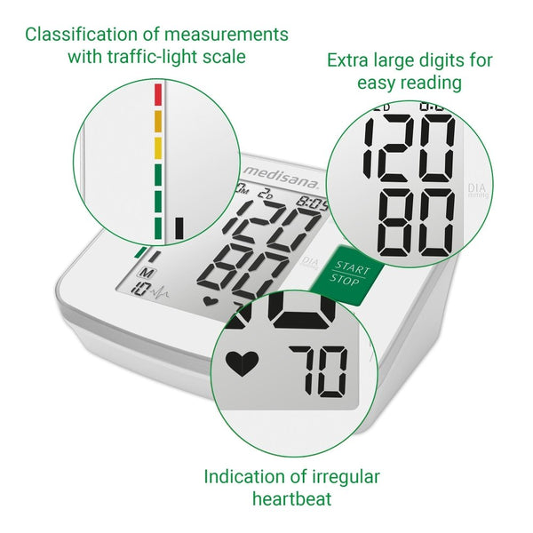 De Medisana BU 512 maakt bloeddruk meten makkelijker! Dankzij het grote LCD-scherm met extra grote cijfers is het meetresultaat duidelijk af te lezen.