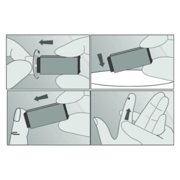 - Je hoort een lichte klik als het lancetje in de huid prikt.