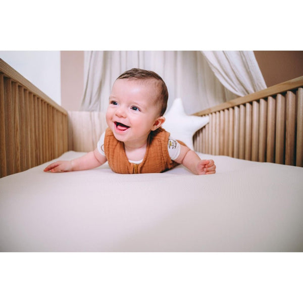 Middenlaag: De honingraatkern biedt een stevig luchtkussen dat het gewicht van je baby draagt zonder in te deuken, waardoor veilig ademen gegarandeerd is, zelfs wanneer het kindje op de buik slaapt.